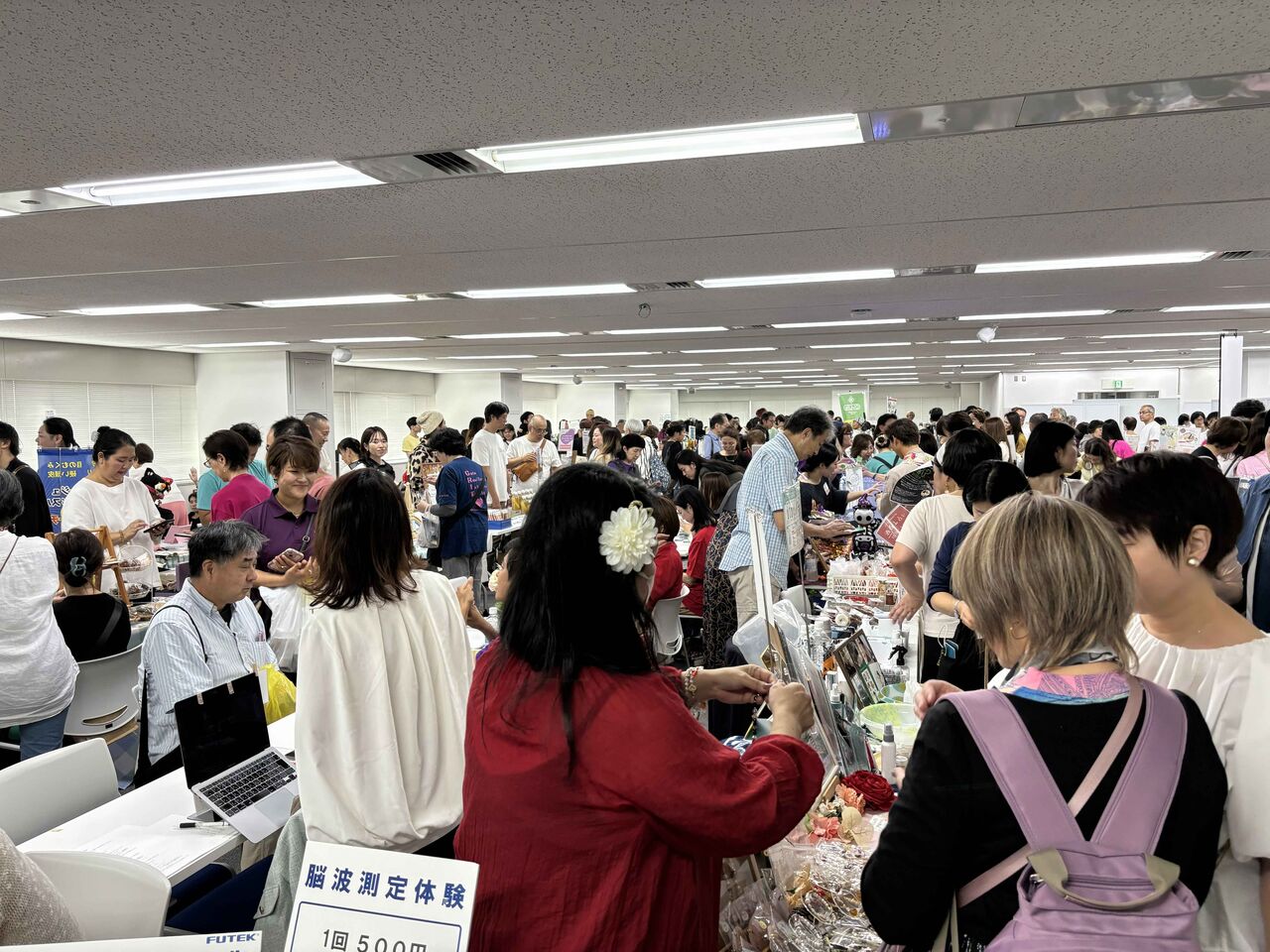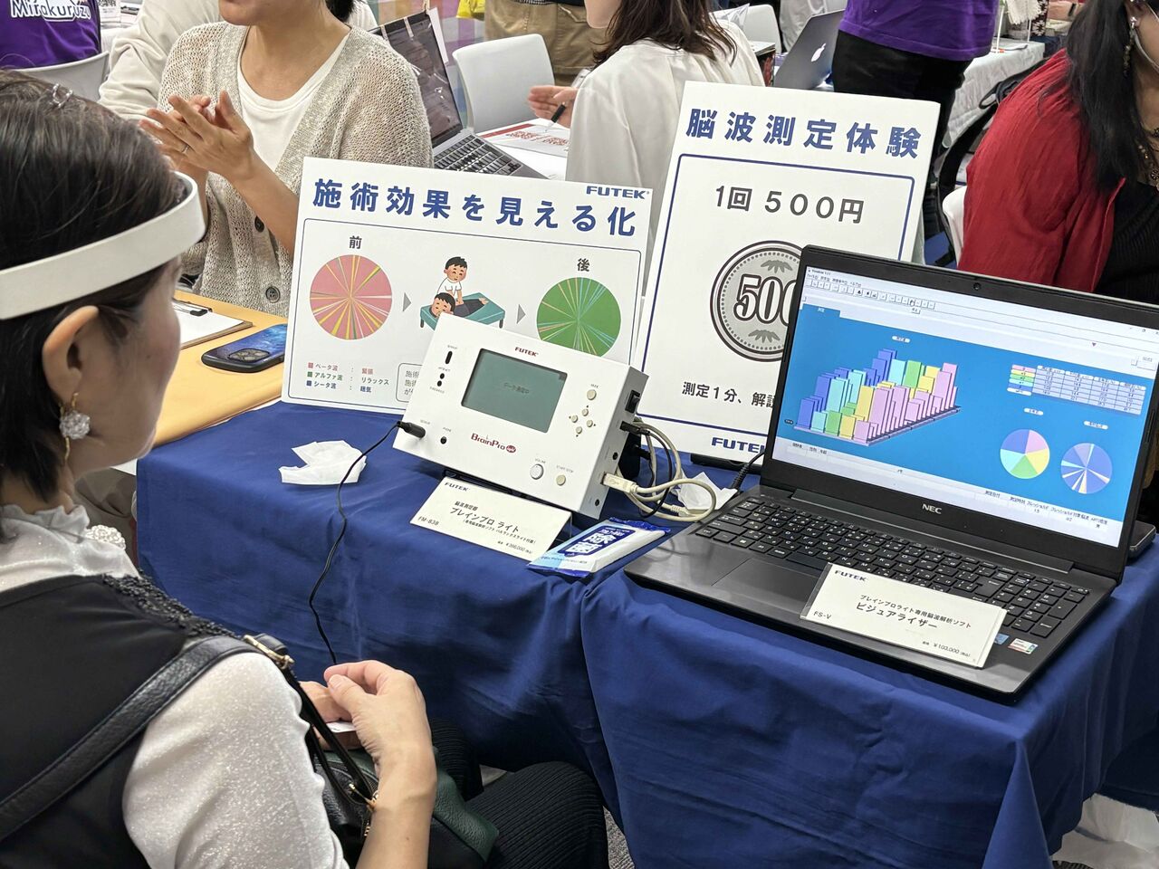 当社ブースでは、**脳波計「ブレインプロライト」**を展示。事前情報どおり、来場者にはスピリチュアル寄りの施術者やセラピストの方が多く、体験ブース形式で脳波計をご紹介しました。